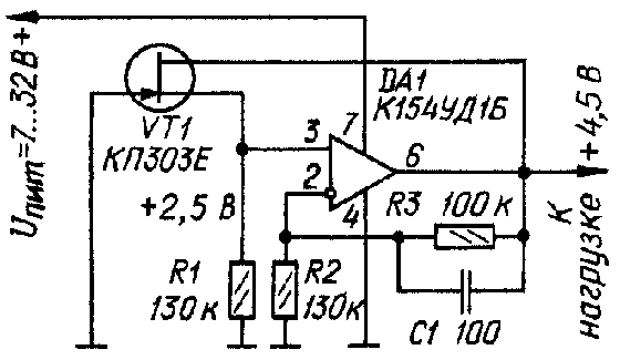 Напряжение смешения полевого транзистора VT1, являющееся в стабилизаторе образцовым, формируется на резисторе R1. ОУ DA1 включен по схеме неинвертирующего усилителя, коэффициент усиления которого задан делителем R2R3, включенным в цепь отрицательной обратной связи. Так как на иеинвертирующий вход ОУ DA1 подано образцовое напряжение Uобр, то на его выходе будет Uвых = (R3/R2+1)*Uобр.