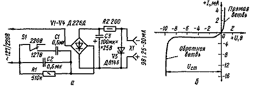 Детали. Диоды типа Д226; стабилитрон Д814Б или Д809; конденсаторы С1, С2 типов КБГ, БМТ.