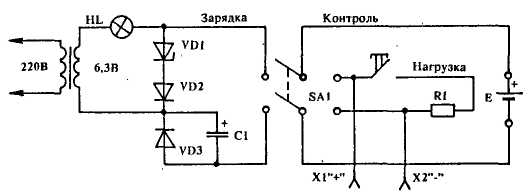 напряжением 6,3 В. Лампа накаливания HL (6,3 В; 0,22 А) выполняет не только сигнальные фнукцин, но и ограничивает зарядный ток элемента, а также предохраняет трансформатор в случае коротких замыканий в цепи заряда. Стабилитрон VD1 типа КС119А ограничивает напряжение' заряда элемента. Он может быть заменен набором нз последовательно включенных диодов ≈ двух кремниевых и одного германиевого ≈ с допустимым средним током не менее 100 мА. Диоды VD2 и VD3 ≈ любые кремниевые с тем же допустимым средним током. Емкость конденсатора С ≈ от 3 до 5 мк на рабочее напряжение иа менее 16В. Цепь из переключателя S1, контрольных гнезд XI, Х2 для подключения вольтметра, кнопки S2 и резистора R с сопротивлением 10 Ом служит для контроля состояния элемента Е до и после подзарядки.