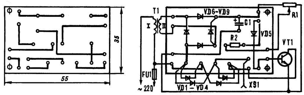 Теперь перейдем к конструкции прибора. Диодные блоки, конденсатор, резистор R2 и диод VD6 устанавливаются на монтажной плате размером 55х35 мм, выполненной из фольгированного гетинакса или текстолита толщиной 1-2 мм (рис.2).