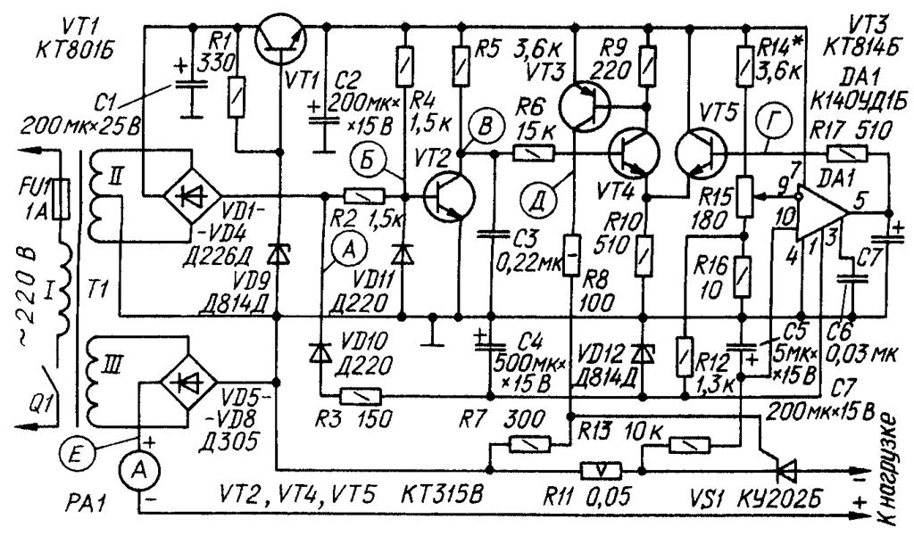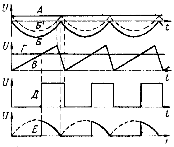 На транзисторе VT2 собран генератор пилообразного напряжения. Через резистор R4 на базу транзистора VT2 подано открывающее напряжение (диаграмма А), а через резистор R2 с двуполупериодного выпрямителя на диодах VD1-VD4 поступает закрывающее пульсирующее напряжение (Б). Суммарное напряжение на базе транзистора VT2 показано штриховой линией Б'. Диод VD11 ограничивает амплитуду закрывающего напряжения. Сопротивление резисторов R2 и R4 выбрано таким, что транзистор большую часть времени закрыт. Конденсатор С3 заряжается через резистор R5. Но в момент приближения сетевого напряжения к нулю транзистор VT2 открывается, разряжая конденсатор С3. На коллекторе транзистора формируется напряжение, близкое по форме к пилообразному (диаграмма В). Через резистор R6 оно поступает на один из входов дифференциального усилителя на транзисторах VT4, VT5, а на другой подается напряжение (Г) с выхода ОУ DA1, которое зависит от положения движка резистора R15.
