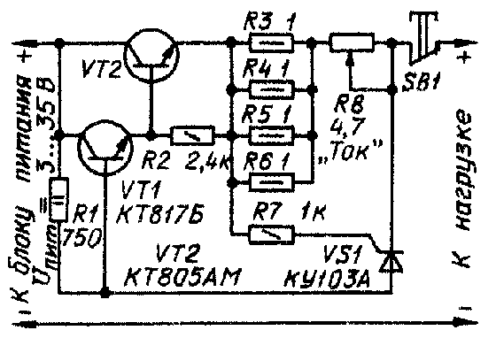редохранитель выполнен в виде двухполюсника и может работать совместно с блоком питания с регулируемым выходным напряжением в пределах 3...35 В. Максимальное полное падение напряжения на предохранителе не превышает 1,9 В при максимальном токе нагрузки. Ток срабатывания защитного устройства можно плавно регулировать в пределах от 0,1 до 1,5 А независимо от напряжения на нагрузке. Электронный предохранитель обладает хорошими термостабильностью и быстродействием (3... 5 мкс), надежен в работе.