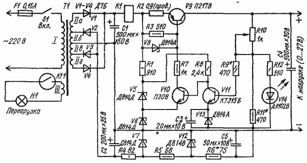 Налаживание стабилизатора начинают с того, что вместо резистора R11 включают переменный резистор сопротивлением 1 кОм и устанавливают его движок на максимальное сопротивление. Движок резистора R10 должен находиться в нижнем (по схеме) положении. Включают стабилизатор и, вращая движок переменного резистора, установленного вместо резистора R11*, устанавливают выходное напряжение 27 В. После этого измеряют сопротивление действующей части переменного резистора и вместо него включают резистор R11* с постоянным сопротивлением, равным измеренному.