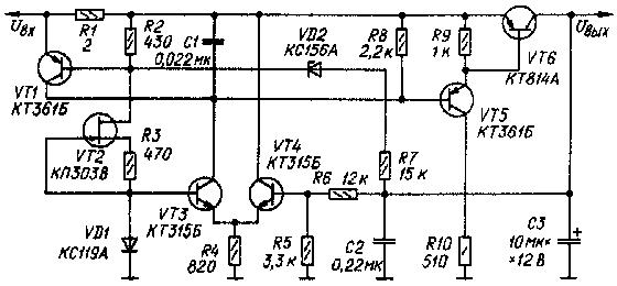 ределы изменения входного напряжения можно расширить в сторону увеличения использованием стабилитрона VD2 с более высоким напряжением стабилизации. При этом, однако, нагрузочная характеристика несколько изменится.