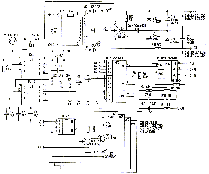 Если используемый трансформатор обладает достаточным запасом мощности, можно увеличить зарядный ток или число каналов. Для увеличения зарядного тока достаточно заменить зарядные ключи 1VT1…4VT1 на составные транзисторы (например КТ973), стабилитрон VD3 -–на КС139 (или КС147) и изменить сопротивление и мощность токозадающих ресторов 1R1…4R1. Число каналов можно увеличить до 8 применив 8-канальный мультиплексор К561КП2 и соответственно изменив схему.