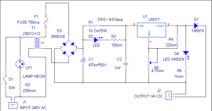 Схему легко можно трансформировать в схему регулируемого стабилизированного блока питания, установив вместо сопротивления R1 перемычку и исключив из схемы детали D2, R2, D1. Сопротивление R5 лучше поставить в этом случае переменного типа и вывести на переднюю панель устройства.