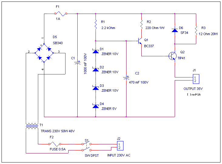 Схема представленная на рисунке выше представляет собой простой стабилизатор напряжения Диапазон рабочих напряжений от 30 до 50 вольт определяется подбором стабилитронов. Указанные в схеме элементы обеспечивают выходное напряжение 35 Вольт. Транзистор Q2 требуется установить на радиатор. В целях уменьшения рассеиваемой мощности на транзисторе в цепи коллектора транзистора включено сопротивление, которое набирается подбором параллельно соединенных резисторов. Для уменьшения потерь и колличества выделяемого тепла на транзисторе Q2, желательно чтобы разность между входным и выходным напряжением была в пределах 3-5 вольт.