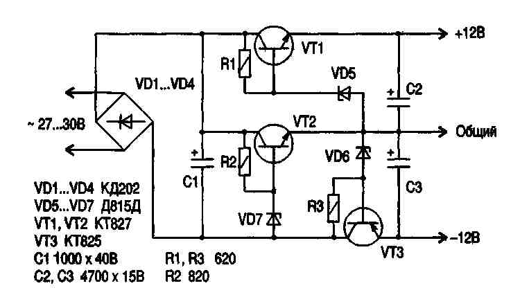 Рассмотрим работу устройства. Если присмотреться - схема состоит из трех простейших стабилизаторов напряжения. При подключении к источнику питания на коллектор VT2 поступает +27 В, с его эмиттера относительно минуса снимается стабилизированное +12 В, следовательно, между коллектором и эмиттером VT2 разница напряжений составляет 15 В Именно это напряжение и использует VТ1, на его эмиттере относительно эмиттера VT2 также стабилизированное +12 В, а относительно минуса напряжение +24 В. Все вроде бы хорошо, в работе разобрались, получили «плюс», «общий» и «минус» и нет необходимости в применении стабилизатора по минусу на VT3 Однако представим себе ситуацию короткое замыкание выхода верхнего по схеме плеча, тогда эмиттер VT2 окажется замкнутым с эмиттером VT1, на общем проводе относительно минуса окажется +24 В, проще говоря, на нижнем по схеме плече относительного «общего» будет -24 В Это может привести к выводу из строя питающей аппаратуры. Чтобы этого не произошло и установлен стабилизатор по минусу, собранный на VT3.