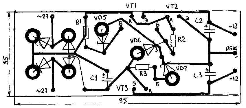 Конструкция и детали Все детали стабилизатора, кроме транзисторов, установлены на печатной плате из однослойного фольгированного текстолита размером 35х95 мм. Транзисторы «посажены» на теплоотводы из дюралюминия и соединены с печатной платой отрезками многожильного провода. Номиналы конденсаторов и сопротивления резисторов могут быть изменены на 20-25 %. Печатная плата показана на рис.2. Если все детали исправны, правильно собранная схема в наладке не нуждается и начинает работать сразу