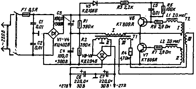 Принципиальная схема такого источника питания изображена на рисунке. На выходе блока получают двуполярное напряжение 2х27 В при токе нагрузки до 0,6 А. Амплитуда пульсаций выходного напряжения при максимальном токе нагрузки не превышает 30 мВ. Выпрямитель сетевого напряжения собран на диодах V1-V4. Преобразователь выпрямленного напряжения выполнен на транзисторах V6, V7 и трансформаторах Т1 и Т2, а выпрямитель напряжения повышенной частоты - на диодах V8-V11. Рабочая частота преобразователя напряжения 22 кГц. Конденсаторы С1 и С2 необходимы для защиты питающей сети от помех; возникающих при работе преобразователя. Резисторы R1 и R2 совместно с конденсаторами С3С4 являются первичным фильтром и одновременно делителем напряжения для преобразователя. Цепочка V5. R3, C5, R5 служит для облегчения запуска генератора преобразователя. - Фильтром выпрямленного высокочастотного напряжения служат конденсаторы С6, С7. Использование двух трансформаторов в преобразователь напряжения позволило увеличить его КПД. В обычных преобразователях с одним трансформатором последний работает в режиме насыщения. В преобразователе с двумя трансформаторами выходной трансформатор Т1 работает в линейном режиме при значительно меньших индукциях, чем в одно-трансформаторном преобразователе. Это позволяет уменьшить потери в сердечнике, а следовательно, повысить КПД преобразователя. Насыщающийся трансформатор Т2 рассчитан только на мощность, потребляемую базовыми цепями транзисторов V6 и V7 и поэтому имеет небольшие размеры. В преобразователях с одним трансформатором в момент переключения транзисторов появляется значительный выброс коллекторного тока. В преобразователе с двумя трансформаторами этот выброс практически отсутствует, что значительно снижает так называемые динамические потери и повышает общий КПД преобразователя.