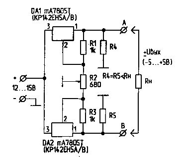 Источник питания выполнен на основе двух регулируемых стабилизаторов напряжения DA1, DA2 типа mA7805 (LM7805) или их аналога - КР142ЕН5А(В). Регулировка выходного напряжения стабилизаторов взаимозависима и осуществляется потенциометром R2. Так, при изменении величины R2 напряжение на резисторе R4 изменяется от 5 до 10 В; одновременно напряжение на резисторе R5 изменяется от 10 до 5 В. Таким образом, выходное напряжение на зажимах АВ плавно регулируется от +5 до -5 В.
