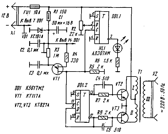 Для решения этой проблемы и был разработан преобразователь (см. схему), позволяющий питать от аккумуляторной батареи многие бытовые электроприборы мощностью до 100 Вт.