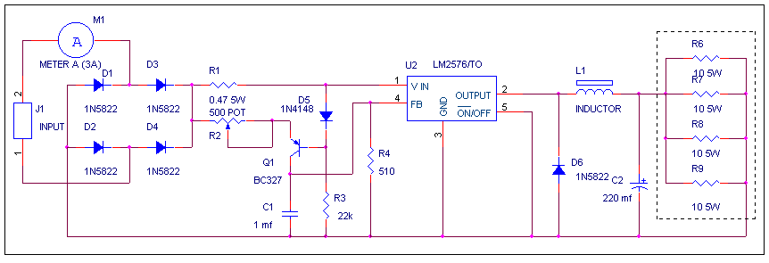 Ниже представлена схема регулятора активной нагрузки. Диапазон регулирования тока 0.2 - 3.0 А. Диапазон рабочих напряжений - 8-20 Вольт. После установки требуемого тока - устройство автоматически поддерживает ток в заданном диапазоне. Микросхему U2 требуется установить на радиатор. Регулировка тока осуществляется потенциометром R2. Нагрузочные сопротивления желательно установить в месте, в котором обеспечивался бы теплообмен с окружающей средой. В процессе работы температура на нагрузочных сопротивлениях может доходить до 80-100 С. Индуктивность катушки 100 mH (52 kHz 3A)