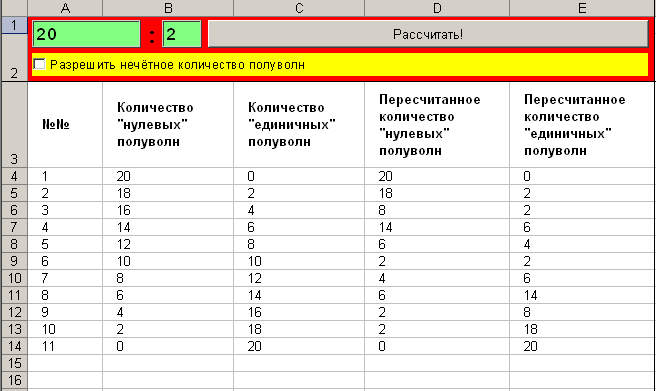 Для примера, зададимся числом полупериодов = 100. Тогда удалив один полупериод, мы понизим мощность паяльника на 1%, удалив 50 полупериодов - понизим мощность на 50%. Но 50% можно получить и по другому, выкусывая каждый второй полупериод! Также, можно найти кратные значения и для других комбинаций полупериодов. Чтобы не считать каждый раз всю таблицу вручную, на языке VBA (Visual Basic for Application) из состава Microsoft Excel была написана вспомогательная программа, в которой можно задаться количеством полупериодов, шагом "выкусывания", а также разрешить или запретить нечётное количество полуволн: