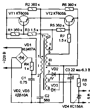 Высокочастотные колебания выпрямляют диоды VD2, VD3, пульсации сглаживает конденсатор СЗ. Выходное напряжение поддерживается постоянным стабилитроном VD4. К выходу источника питания можно подключать нагрузку с потребляемым током до 40 мА. При большем токе увеличиваются низкочастотные пульсации и уменьшается выходное напряжение.