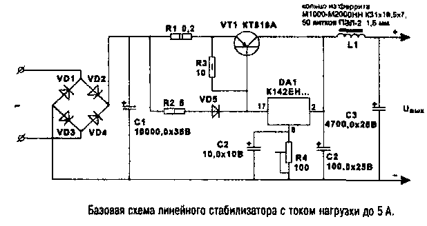 На рисунке приведена базовая схема для построения мощных стабилизаторов, обеспечивающих ток нагрузки до 5 А. чего вполне достаточно для запитывания большинства радиолюбительских конструкции. Схема выполнена с применением микросхемы стабилизатора серии КР142 и внешнего проходного транзистора.
