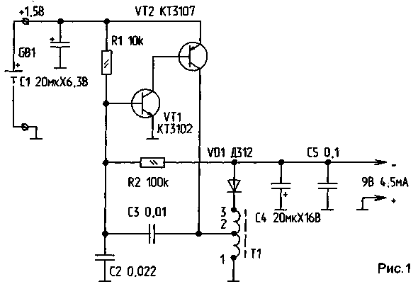 Время открытого состояния транзистора VT2 определяется индуктивностью обмотки 1-2 автотрансформатора Т1 и емкостями С2 и СЗ. Частота генерации зависит от напряжения на базе транзистора VT 1. Стабилизация выходного напряжения осуществляется за счет ООС по постоянному напряжению посредством R2. При этом при понижении-выходного напряжения увеличивается частота генерируемых импульсов при примерно одинаковой их длительности. В результате увеличивается частота подзарядки конденсаторов фильтра С4 и С5 и падение напряжения на нагрузке компенсируется. При увеличении выходного напряжения частота генерации наоборот уменьшается. Так, после зарядки накопительного конденсатора в ПДУ частота генерации падает в десятки раз. Остаются лишь редкие импульсы, компенсирующие разрядку конденсаторов в режиме покоя. Этот способ стабилизации позволил довести ток покоя преобразователя до 0,5 мА.