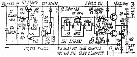 При снижении уровня питающего напряжения уменьшается ток, потребляемый ОУ — это тоже упрощает проблему источника питания для переносной аппаратуры. Для большинства ОУ при питании напряжением ±5 В потребляемый ток уменьшается примерно в 3 раза по сравнению с питанием напряжением ±15 В. Разумеется, снижение питающего напряжения ведет к изменению и других параметров ОУ, но эти отклонения обычно не сказываются на работе схемы. В качестве источника питания переносных приборов удобно применить батарею “Крона-ВЦ” или “Корунд” напряжением 9 В, а двуполярное питание +5,5 и —4,8 В получить с помощью устройства, описываемого ниже. Напряжение +5,5 В стабилизированное, оно предназначено ь не только для питания ОУ, но может быть использовано для цифровых микросхем серий К134, К176, К561. Узел питания выдает еще и напряжение —10 В, которое при необходимости используется для управления электронными коммутаторами на полевых транзисторах серий К168 и К190.