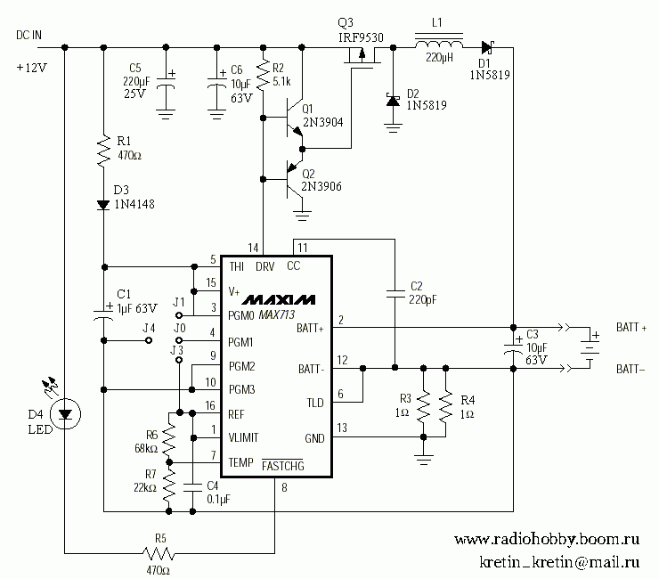 Данное устройство предназначено для зарядки аккумуляторов типа NiMh . Так же может использоваться и для зарядки NiCd. Устройство имеет возможность заряжать одновременно от 1 до 4 аккумуляторных батарей, что делает устройство более удобным в эксплуатации. Количество батарей программируются перемычками J0, J1, J3, J4 см. таблицу 1. Устройство работает по так называемому Дельта V методу и самостоятельно определяет степень заряда аккумуляторов. Как только устройство убедится в в том что аккумуляторы полностью заряжены, он сразу же перейдёт в "капельный" режим заряда, порядка 10 мА. Этого количества вполне достаточно для того чтобы предотвратить саморазряд аккумуляторов. Ток заряда равен 500 мА . В случае если аккумуляторная батарея испорчена и устройство не может определить степень зарядки аккумулятора, срабатывает встроенный таймер который запрограммирован на 264 минуты, устройство отключается. Устройство питается стабилизированным напряжением равным 10-12В, 0.8А. Возможно установка батарей как при включенном так и при выключенном зарядном устройстве. Хотя рекомендую устанавливать батареи до включения устройства в розетку. Светодиод D4 служит как индикатор зарядки аккумуляторов т.е когда батареи заряжены он перестаёт светиться. Если в устройство установить полностью заряженные аккумуляторы, то устройство определит это и отключиться через 10-15 минут работы. Резисторы R3, R4 в разводке печатной платы я заменил на три резистора по 1,5 Ома