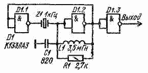 При использовании кварцевых резонаторов на другие частоты изменится соответственно и частота следования импульсов. Генератор можно собрать только на двух элементах микросхемы D1, не используя D1.3. Этот инвертор желательно установить для того, чтобы уменьшить влияние нагрузки на генератор. Питать такой генератор можно от любого источника напряжением 5... 10 В. Микросхемы К133ЛАЗ можно заменить любой, имеющей элементы И-НЕ.
