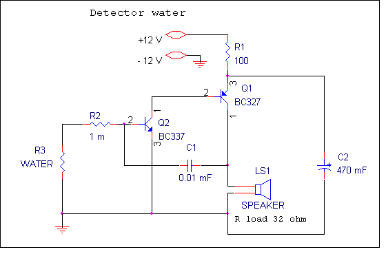 Представленная выше схема это простой индикатор воды. Чаще всего используется для сигнализации о состоянии уровня воды в различных конструкциях. Датчик устройства это "сопротивление" R3 по схеме - представляет собой обычный электропроводник. Чаще всего для сохранения надёжности устройства в качестве электрода применяют серебрянную или посеребрённую пластину. Соединение пластины с проводом обеспечивают механическим способом (крепежом с хромовым покрытием). Если датчик находится на значительном удалении от устройства (несколько десятков метров) необходимо позаботиться о соответствующем сечении провода и надёжности заземления устройства и водяной конструкции. ( Как вариант возможно сделать датчик с двумя электродами и не заземлять конструкцию).