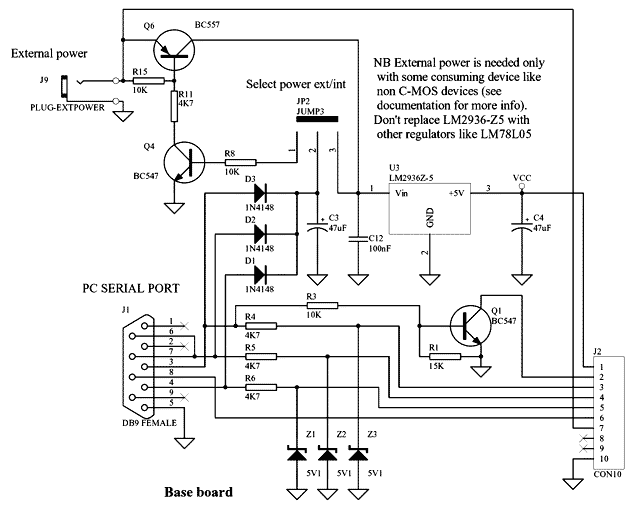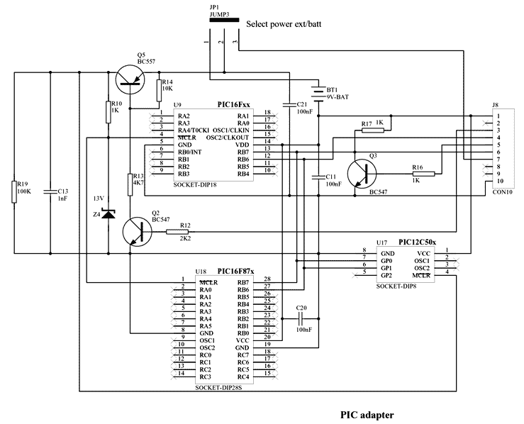 SI-Prog базовый блок: подключается к последовательному порту через разъем PC DB9. Вы можете подключать нижеописаные адаптеры в CON10. Схема питается от последовательного порта либо от внешнего источника питания.