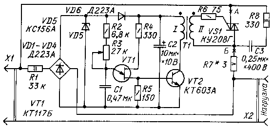 В регуляторе использованы постоянные резисторы - МЛТ, переменный резистор R3 - СП4-1, конденсатор C1 - КМ-6 (можно МБМ), С3- МБГП, оксидный С2-К50-6. Резистор R7 намотан нихромовым проводом диаметром 0,3 мм на резисторе МЛТ-2 сопротивлением не менее 100 Ом. Однопереходный транзистор VT1 может быть КТ117А. Транзистор VT2 - КТ603А или любой из серий КТ312, КТ315. Диоды Д223А можно заменить на Д220 или КД521А, симистор КУ208Г - на два тринистора серии КУ202, включив их встречно-параллельно, как показано на рис.4.