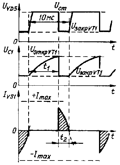 Резистор R7 - элемент цепи ОС по току в нагрузке. Действие ОС иллюстрируют кривые, снятые при неизменном положении движка переменного резистора R2 и работе электродрели на холостом ходу (рис.2) и под нагрузкой (рис.3). Здесь t1 - ремя зарядки конденсатора C1, t2 - время, в течение которого