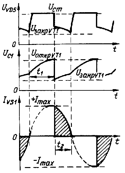 При некотором пороговом напряжении на конденсаторе С1 однопереходный транзистор открывается, и на его нагрузочном резисторе R5 появляется импульс напряжения, который транзистор VT2 усиливает до уровня, необходимого для включения симистора. Симистор остается открытым до тех пор, пока ток, текущий через него, не уменьшится до порога его выключения. При этом конденсатор С1 разряжается до напряжения закрывания однопереходного транзистора VT1. После выключения симистора конденсатор С1 снова заряжается - начинается следующий цикл работы узла управления симистором.