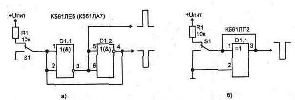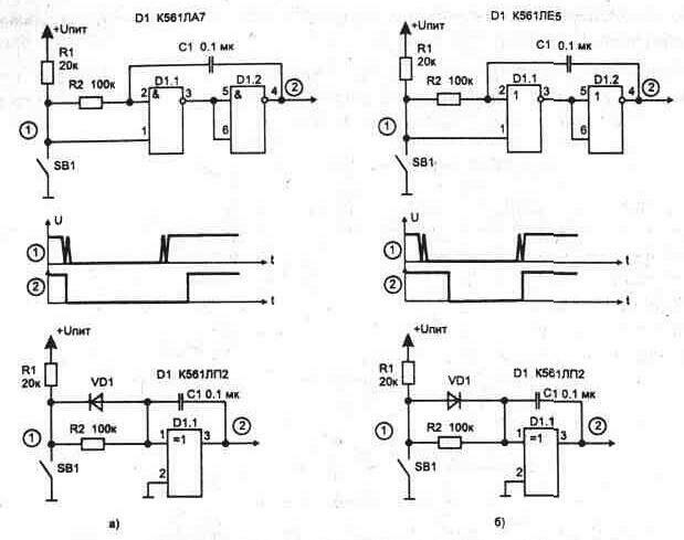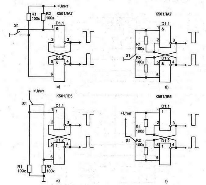 Особенности микросхем, работающих в режиме микротоковНепосредственная подача сигналов на входы микросхем от кнопок и переключателей не всегда допустима из-за так называемого "дребезга" - многократного неконтролируемого замыкания и размыкания контактов в момент переключения (происходит из-за механического резонанса в течение времени до 40...100 мс). Нечувствительными к дребезгу являются входы начальной установки триггеров, счетчиков и регистров (обнуление по входам R). В этом случае могут использоваться схемы рис. 1.1. Подача логических уровней сигнала на счетные входы микросхем требует подавления дребезга - без этого возможно случайное многократное срабатывание счетчиков. На рис. 1.2 приведены схемы подавления дребезга с помощью RS-триггера, собранного на отдельных ЛЭ. Варианты приведенные на рис. 1.2в и 1.2г,