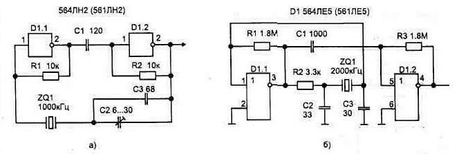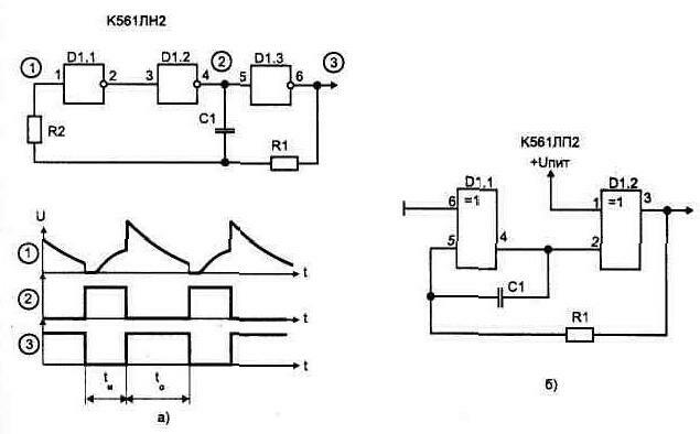 Особенности микросхем, работающих в режиме микротоковВариант простейшего генератора (мультивибратора) показан на рис. 1.30а. Схема имеет два динамических состояния. В первом из них, когда на выходе D1.1 состояние лог. "1" (выход D1.2 лог. "0"), конденсатор С1 заряжается. В процессе заряда напряжение на входе инвертора D1.1 возрастает, и при достижении значения Uпор=0,5Uпит происходит скачкообразный переход во второе динамическое состояние, в котором на выходах D1.1 лог. "О", D1.2 - "1". В этом состоянии происходит перезаряд емкости (разряд) током обратного направления. При достижении напряжения на С1 Unop происходит возврат схемы в первое динамическое состояние. Диаграмма напряжений поясняет работу. Резистор R2 является ограничительным, и его сопротивление не должно быть меньше 1 кОм, а чтобы он не влиял на расчетную частоту, номинал резистора R1 выбираем значительно больше R2 (R2<0,01R1). Ограничительный резистор (R2) иногда устанавливают последовательно с конденсатором. При использовании неполярного конденсатора С1 длительность импульсов (tи) и пауза (tо) будут почти одинаковыми: tи=to=0,7R1C1. Полный период T=1,4R1C1. Резистор R1 и конденсатор С1 могут находиться в диапазоне 20 к0м...10 МОм; 300 пф...100 мкФ. При использовании в схеме (рис. 1.30б) двух инверторов микросхемы К561ЛН2 (они имеют на входе только один защитный диод) перезаряд конденсатора будет происходить от уровня Uпит+Unop. В результате чего симметрич- Рис. 1.30. Генератор импульсов на двух инверторах