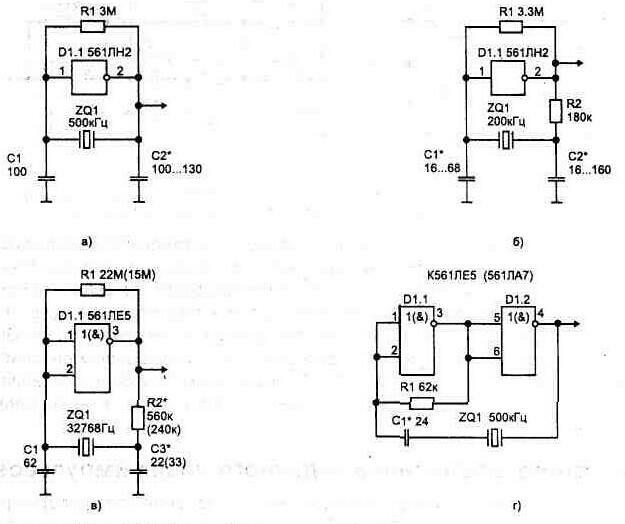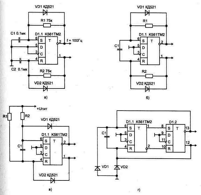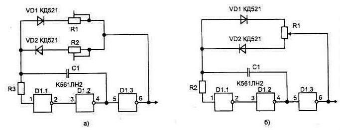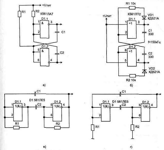 Рис 1 35 Генератор с симметричными импульсами на выходе элемента D1.2. Если соотношение R2/R1 равно отношению R3/R5 может быть получена полная компенсация ошибок обусловленных изменением пороговых напряжении элементов D1.1 и D1.2 При этом предполагается, что все элементы схемы расположены в одном корпусе и их пороговые напряжения фактически равны Частота импульсов такой схемы определяется из соотношения F=1/R5C1 (она будет примерно в два раза выше по сравнению со схемой, показанной на рис. 1.30) Симметричный мультивибратор можно выполнить на основе RS-триггере, рис 1.36. Вариант схемы на рис 1.31в позволяет резисторы R1 и R2 выби Рис1.36 Симметричные мультивибраторы рать более низкоомными, потому что диоды разделяют цепь заряда от выходов триггера. Вторым преимуществом этой схемы является то, что она позволяет легко и независимо регулировать в определенных границах период и скважность генерируемых импульсов. Скважность можно регулировать линейно, если R1 и R2 объединить в один потенциометр, а период - если общий конец R1 и R2 соединить с источником питания через потенциометр. С целью уменьшения количества дискретных элементов предложена схема мультивибратора на двух RS-триггерах, рис. 1.36г. Рис. 1.37 Автогенератор на основе двух логических элементов