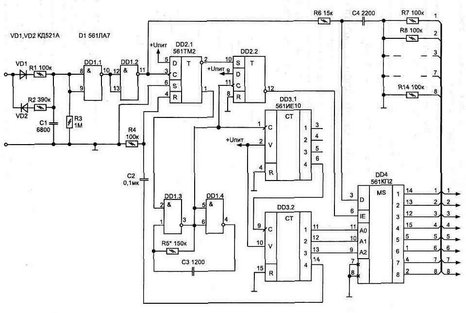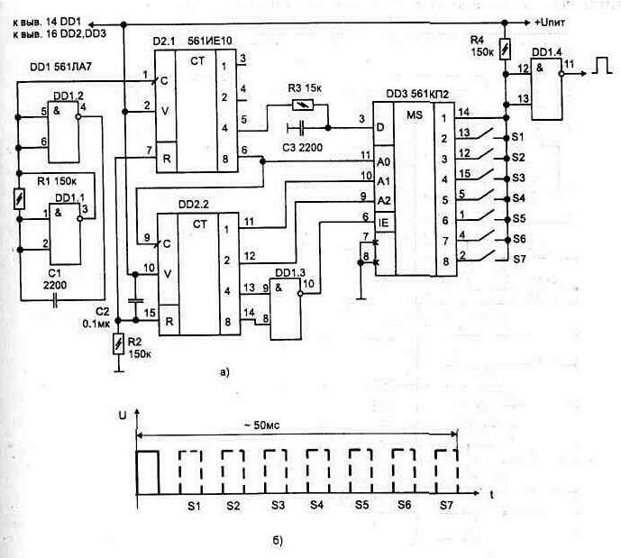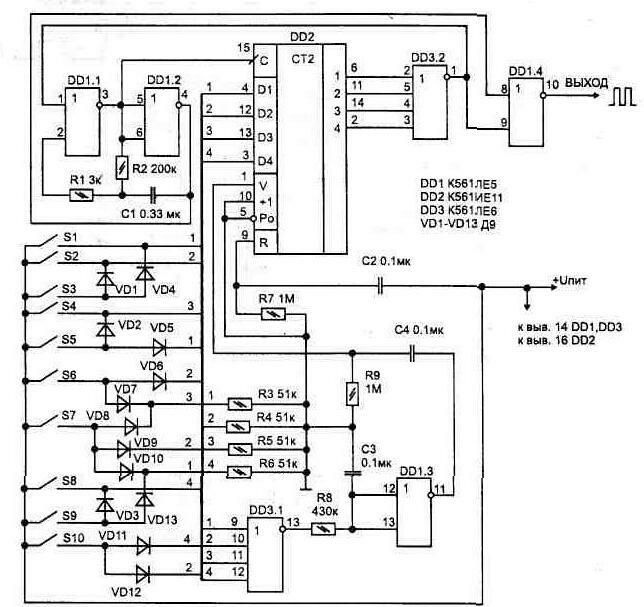 Рис. 1.43. Простейшие схемы формирования пачки импульсов Два варианта таких генераторов показаны на рис. 1.44 и рис. 1.45. Если входной запускающий импульс меньше по длительности периода колебаний, на выходах формируется один импульс. При большей длительности правляющего Электрическая схема, рис. 1.46, формирует от 1 до 7 импульсов в пачке с последующим повторением цикла через время 16Т, пока нажата кнопка. В процессе работы счетчика-дешифратора DD2 на его выходах появляются импульсы, которые управляют переключением триггера DD3.2. Таким образом задается интервал, в течение которого на выходе DD3/12 будет лог. "1", что разрешает прохождение импульсов от автогенератора (DD1.1, DD1.2) через элемент DD1.3 на выход. Второй триггер DD3.1 включен по схеме делителя и обеспечивает появление интервала между пачками. Количество импульсов в пачке соответствует номеру нажатой кнопки. Поформуле T=1,32R1C1 определяется период формируемых импульсов. При этом R1 может иметь номинал от 20 кОм до 10 МОм. -аменой микросхемы DD2 на Рис. 1.44. Управляемый генератор с неискаженной длительностью последнего Рис. 1.45. Вариант управляемого генератора с неискаженной длительностью Рис. 1.46. Формирователь пачки до 7-ми импульсов Схема, приведенная на рис 1.47, обеспечивает при нажатии кнопки однократное формирование пачки до 15 импульсов (на схеме показаны только 10 кнопок). Для повторной выдачи пачки необходимо повторно нажать на соответствующую кнопку. При этом происходит запись соответствующего числа в двоичном коде в регистр предварительной установки счетчика DD2, и он начинает считать на вычитание до момента времени, пока на всех его выходах не установится лог. "0". Логический "0" установится и на выходе DD1.4. Рис. 1.47 Формирователь пачки импульсов Номиналы элементов (R2, С1) на схеме указаны для частоты генератора 10 Гц (частота набора номера в телефонной линии). На схеме показан также пример дешифратора десятичных чисел в двоичный код на диодах типа Д9 (Д2) Воспользовавшись принципом работы данной схемы, можно выполнить формирователь пачки с любым количеством импульсов Для этого последовательно со счетчиком DD2 можно включить еще такие же счетчики, а вместо ди- Рис. 1.48. а) Формирователь кодовой последовательности, б) форма импульсов Иногда требуется иметь пачки импульсов, состоящие из произвольной комбинации положения импульсов относительно начального, - кодовую после довательность. Такой режим обеспечивает схема, рис. 1.48а. Если ни одна из кнопок не нажата, то на выходе (DD1/11) будут появляться одинарные импульсы, с периодом, определяемым частотой задающего генератора на элементах DD1.1, DD1.2. В зависимости от того, какая кнопка нажата, на выходе появится пачка из комбинации импульсов. Причем каждой нажатой кнопке будет соответство Рис. 1.48. в) Дешифратор кодовой последовательности вать определенное положение импульса относительно начального. Эпюры выходного напряжения, рис. 1.48в, поясняют работу схемы. Кнопки могут быть нажаты в любой комбинации или все одновременно. Что позволяет использовать схему в устройствах, где требуется для дистанционного управления одновременная передача нескольких команд. Вариант схемы дешифратора кодовой последовательности показан на рис. 1.48в. При обработке входных пачек импульсов на соответствующих выходах мультиплексора DD4 будут кратковременно появляться импульсы, а дл