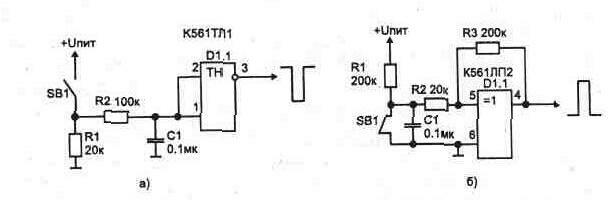 Рис. 1.1. Импульсы с дребезгом на контактахРис. 1.2. Подавление дребезга при помощи: Рис. 1.3. Использование одной микросхемы с четырьмя триггерами для менее помехоустойчивы. Аналогичную схему можно выполнить на RS-триггере микросхемы 561 ТМ2, соединив неиспользуемые входы D и С с 0. Если требуется подавать много сигналов, то лучше воспользоваться мик- Рис. 1.4. Подавление дребезга на триггере с управлением по выходу Рис. 1.5. Формирование длинного импульса с помощью: Чаще удобнее использовать кнопки с одной группой контактов. Высокое входное сопротивление КМОП микросхем и относительно высокое выходное (100...1000 Ом) позволяют упростить узел подавления дребезга (рис. 1.4), но такое включение недопустимо для микросхем с повышенной нагрузочное способностью, например 561ЛН1, 561ЛН2, 176ПУ1,176ПУ2 и т. д., так как их выходные токи при закорачивании выхода на общий провод кратковременно могут достигать десятков миллиампер, что снизит надежность устройства, а также создаст импульсные помехи. Подавление дребезга на контактах возможно с помощью RC-цепи и триггера Шмитта (рис. 1.5). На выходе ЛЭ формируется импульс с крутым фронтом. Рис. 1.6. Подавление дребезга с задержкой включения и выключения Для подавления дребезга от кнопки с одной группой контактов могут применяться схемы, приведенные на рис. 1.6. Они аналогичны по принципу работы. На рис. 1.8 показана схема переключателя на три положения с взаимным выключением на основе трехстабильного триггера. При включении питания лог. "0" с разряженного конденсатора С1 через диод VD1 подается на входы элемен- При проектировании цифровых устройств с подачей управляющих сигналов от многокнопочной клавиатуры для уменьшения числа деталей используют Рис. 1.7. Подавление дребезга с задержкой: