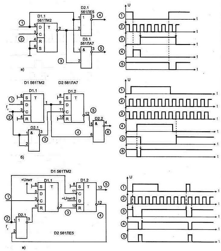Особенности микросхем, работающих в режиме микротоковДля устройств автоматики, дистанционного управления или проверки работы отдельных узлов схемы иногда требуется передавать пачку из определенного числа импульсов Простейшие схемы таких формирователей показаны на рис. 1.43. В них последний импульс пачки может получиться укороченным, если сигнал управления имеет произвольную длительность. Часто в схемах управления необходимо использовать генераторы, в которых независимо от положения фронтов управляющих сигналов обеспечивается неискаженное (по длительности) формирование первого и последнего