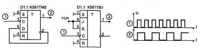 Особенности микросхем, работающих в режиме микротоковНаиболее часто для этого используют счетчики, хотя можно разделить частоту с помощью ждущего мультивибратора, ограничив число проходящих на выход импульсов. Пример такой схемы показан на рис. 1.60. Как только импульс входной частоты поступает на выход 5, ждущий мультивибратор D1.1, D1.3 запирает элемент D1.2 на время, определяемое резистором R1. Когда ждущий мультивибратор возвращается в исходное состояние, на выход поступает следующий импульс и цикл возобновляется. Схему можно усовершенствовать, заменив потенциометр полевым транзистором, что позволит управлять коэффициентом деления с помощью напряжения. Рис. 1.60 Делитель частоты с использованием ждущего мультивибратора Делитель на 2 можно собрать из простейших ЛЭ, рис. 1.61. Схемы делителей без использования RC-цепей имеют лучшую помехоустойчивость и болееширокий диапазон входной частоты сигнала. Основным элементом всех счетчиков является триггер с так называемым счетным входом, рис. 1.62. Таблица 1.4 Таблица 1.4