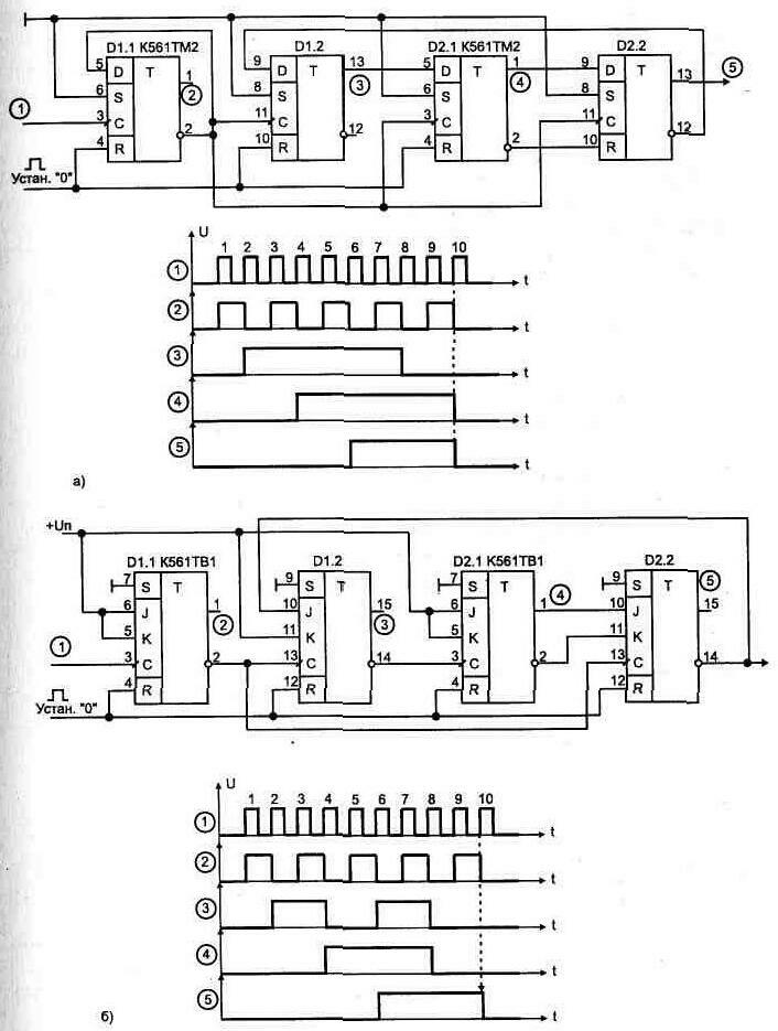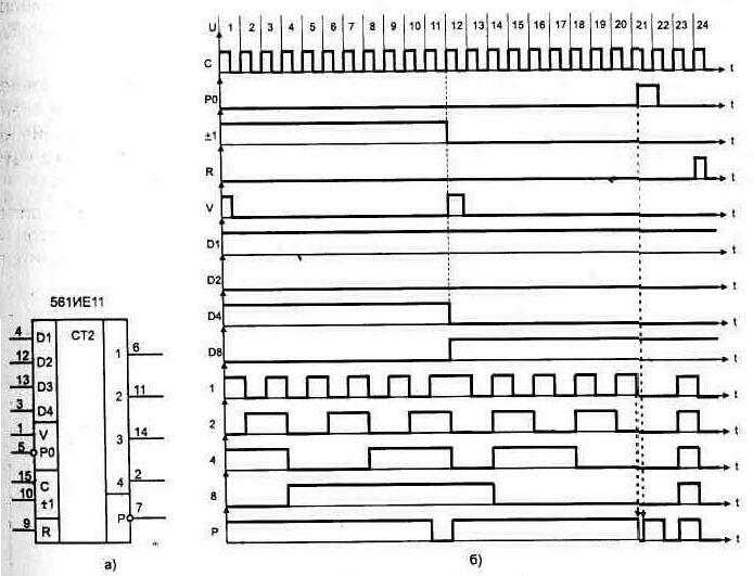 Для получения нужного коэффициента деления можно использовать микросхемы двоичных счетчиков, соединяя соответствующие выходы с помощью ЛЭ, рис. 1.67, или же применить счетчик с программируемым Рис. 1. 66. а) Универсальный реверсивный счетчик,