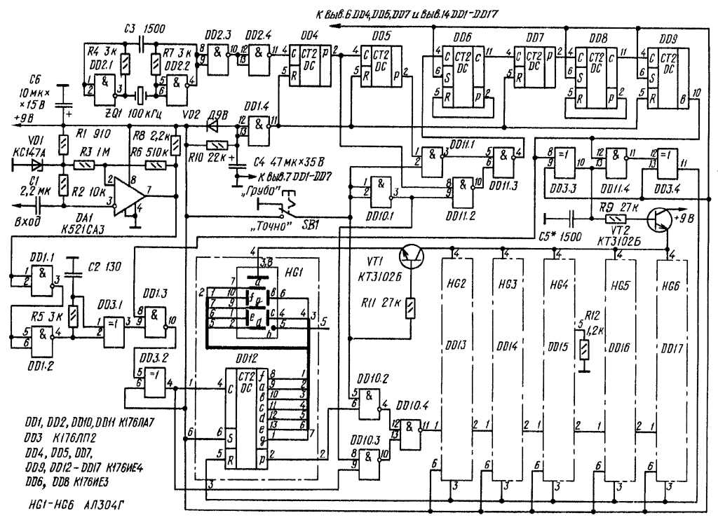 Импульсы с выхода селектора поступают на счетчик импульсов через элемент DD3.2, который исключает лишнее срабатывание счетчика по фронту импульса, задающего измерительный временной интервал. Счетчик импульсов включает в себя шесть однотипных узлов пересчета. В режиме "Точно" все узлы включены последовательно через элементы DD10.2, DD10.4, и импульсы удвоенной частоты с выхода селектора приходят на вход узла младшего разряда (DD12, HG1). В режиме "Грубо" эти импульсы через элементы DD10.3, DD10.4, подаются на второй узел пересчета (DD13, HG2), а транзисторный ключ VT1 выключает индикатор младшего десятичного разряда шкалы.