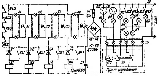 Детали. Реле с сопротивлением обмотки не менее 6 кОм, с двумя группами контактов на замыкание и одной на размыкание (РС-13, РС-52 и др.) регулируется так: при срабатывании сначала замыкаются блокирующие контакты, а затем размыкаются нормально замкнутые контакты. Переключатель S8 типа П2К и кнопки рассчитаны на напряжение не менее 220 В, электролампы HI -НЗ - на напряжение 220 В и мощность 15 Вт, Н4-Н9 - на напряжение ПО В и мощность 8 Вт.
