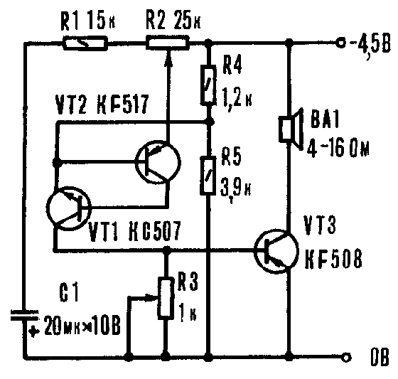 В чехословацком журнале "Аматерске радио" опубликована схема простого метронома. Он применяется в музыкальных школах, на занятиях ритмической гимнастикой, при проведении различных опытов. Основу прибора составляет аналог однопереходного транзистора, образованного комплементарной парой маломощных триодов VT1, VT2 (см. схему). Более мощный транзистор VT3 усиливает короткие импульсы, возникающие на коллекторе VT1. Частота импульсов регулируется переменным резистором R2, а громкость - R3. В метрономе вместо указанных на схеме допустимо использовать отечественные транзисторы: VT1 - КТ315, КТ312; VT2 - КТ361, КТ3107; VT3 - КТ502, КТ814 с любыми буквенными индексами.