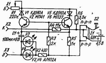 Этим прибором можно проверять транзисторы малой, средней и, в ряде случаев, большой мощности. С помощью резистора R1 оценивают (приблизительно) усилительные свойства проверяемого маломощного транзистора - чем больше сопротивление введенной части резистора, при котором еще работает мультивибратор, тем выше коэффициент передачи по току этого транзистора. Источником питания прибора служит одна батарея 3336Л.