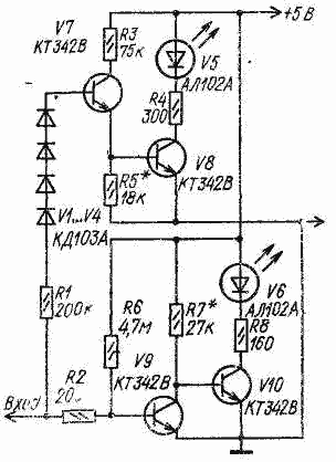 При напряжении на входе от +0,4 до +2,3 В транзисторы V7 и V8 по-прежнему закрыты, V9, открыт, V10 закрыт. Светодиоды не горят. При напряжении выше +2,3 В открываются транзисторы V8, V9 и загорается красный светодиод V5, индицируя "1". Диоды V1- V4 служат для повышения напряжения, при котором срабатывает пороговое устройство, индицирующее "1".