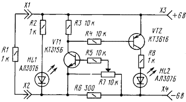 А что будет при коротком замыкании в цепи нагрузки? Для этого достаточно замкнуть (на короткое время) гнезда Х1 и Х2. Снова вспыхнет светодиод HL2, а HL1 погаснет.