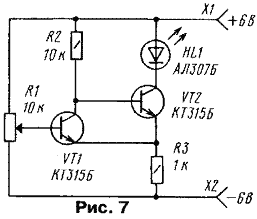 Медленно перемещая движок переменного резистора вверх по схеме, удастся достичь момента, когда произойдет скачкообразное открывание транзистора VT1 и закрывание VT2. Это случится при превышении напряжения на базе VT1 падения напряжения на резисторе R3. Светодиод погаснет.