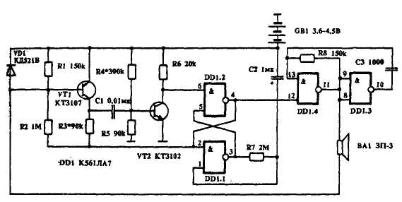 Принципиальная схема брелока состоит из триггера-одновибратора (DD1.1, DD1.2), звукового генератора (DD1.3, DD1.4), усилителя на транзисторах (VT1, VT2) и приемника-излучателя звукового сигнала (BA1). Действует схема так. В состоянии "ожидания" на выводе 4 элемента DD1.1 присутствует сигнал низкого уровня, а на выводе 3 элемента DD1.2 ≈ высокого. При поступлении с усилителя звукового сигнала триггер переключается. На выводе 4 элемента DD1.1 появляется сигнал высокого уровня, разрешая работу звукового генератора. Одновременно через резистор R7 заряжается конденсатор С2. По окончании времени t - 1/2R7C2 напряжение на входе 1 элемента DD1.2 падает до уровня переключения триггера, и брелок замолкает.