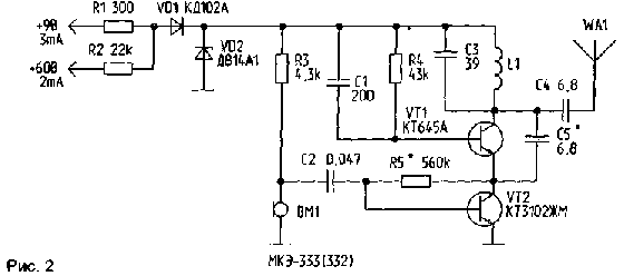 Микромощные радиопередатчики, выходная мощность которых составляет от долей до единиц милливатт, могут использоваться для организации радиосвязи и передачи данных на расстояние в пределах нескольких метров. Описываемые ниже устройства работают в диапазоне частот 66...74 МГц и при необходимости могут быть перестроены для работы в другом частотном диапазоне. Во всех конструкциях использованы высокоэффективные малогабаритные электретные микрофоны типа МКЭ-332, содержащие встроенный предусилитель на полевом транзисторе. На рис.1 дана схема радиомикрофона, в базовую цепь смещения которого включен в качестве управляемого резистора электретный микрофон.