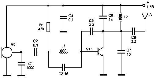 я путем изменения потенциалов выводов генерирующего элемента. В нашем случае управляющее напряжение прикладывается к базе транзистора VT1, изменяя тем самым напряжение смещения на переходе база-эмиттер и, как следствие, изменяя емкость перехода база-эмиттер. Изменение этой емкости приводит к изменению резонансной частоты колебательного контура, что и приводит к появлению частотной модуляции. При использовании УКВ приемника импортного производства требуемая величина максимальной девиации несущей частоты составляет 75 кГц (для отечественного стандарта - 50 кГц) и получается при изменении напряжения звуковой частоты на базе транзистора в диапазоне 10-100 мВ. Именно поэтому в данной конструкции не используется модулирующий усилитель звуковой частоты. При использовании электретного микрофона с усилителем, например, МКЭ-3, М1-Б2 "Сосна", уровня сигнала, снимаемого непосредственно с выхода микрофона, оказалось достаточно для получения требуемой девиации частоты радиомикрофона. Конденсатор С1 осуществляет фильтрацию колебаний высокой частоты. Конденсатором С7 можно в небольших пределах изменять значение несущей частоты. Сигнал в антенну поступает через конденсатор С8, емкость которого специально выбрана малой для уменьшения влияния возмущающих факторов на частоту колебаний генератора. Антенна сделана из провода или металлического прутка длинной 60-100 см. Длину антенны можно уменьшить, если между ней и конденсатором С8 включить удлинительную катушку L3 (на рис не показана). Катушки радиомикрофона бескаркасные, диаметром 2,5 мм, намотаны виток к витку. Катушка L1 имеет 8 витков, катушка L2 - 6 витков, катушка L3 - 15 витков провода ПЭВ 0,3. При настройке устройства добиваются получения максимального сигнала высокой частоты, изменяя индуктивности катушек L1 и L2. Подбором конденсатора С7 можно немного чить совсем.