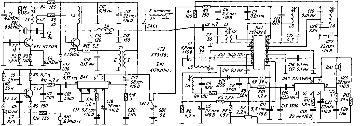 rst2103При налаживании передатчика подстроечником катушки L1 добиваются устойчивого возбуждения кварцевого резонатора задающего генератора на третьей гармонике. Затем последовательной подстройкой катушек L4 и L5 добиваются максимальной излучаемой мощности (контролируют по внешнему индикатору поля). После этого проверяют модуляцию. Если при этом наблюдается перемодуляция, уменьшают усиление каскада на транзисторе VT2 (устанавливают резистор R9 с большим номиналом). И, наоборот, если модуляция "мелковата", то устанавливают этот резистор с меньшим номиналом. Налаживание приемника сводится к аналогичным процедурам. Сначала добиваются подстройкой катушки L3 устойчивой работы гетеродина, а затем подстройкой катушек L1 и L4≈L6 ≈ максимальной чувствительности приемника.