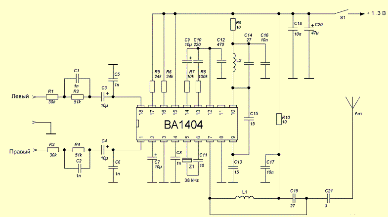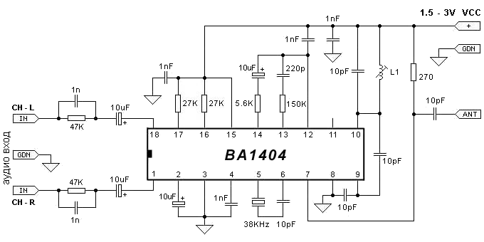 Передатчик может работать от одного элемента 1.5V и обеспечивает превосходный совершенно прозрачный стерео звук. Схема может также работать от двух элементов 1.5V, чтобы обеспечить максимальный диапазон.
