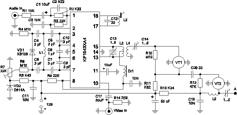 Передатчик работает в диапазоне ДМВ (UHF) и построен на одной микросхеме и двух СВЧ транзисторах. Он обеспечивает идеальное качество цветной картинки на расстоянии около 50 м. Максимальный радиус действия зависит от чувствительности телевизора, применяемых антенн, и для цветного изображения составляет 300 м, а черно белого - более 500.